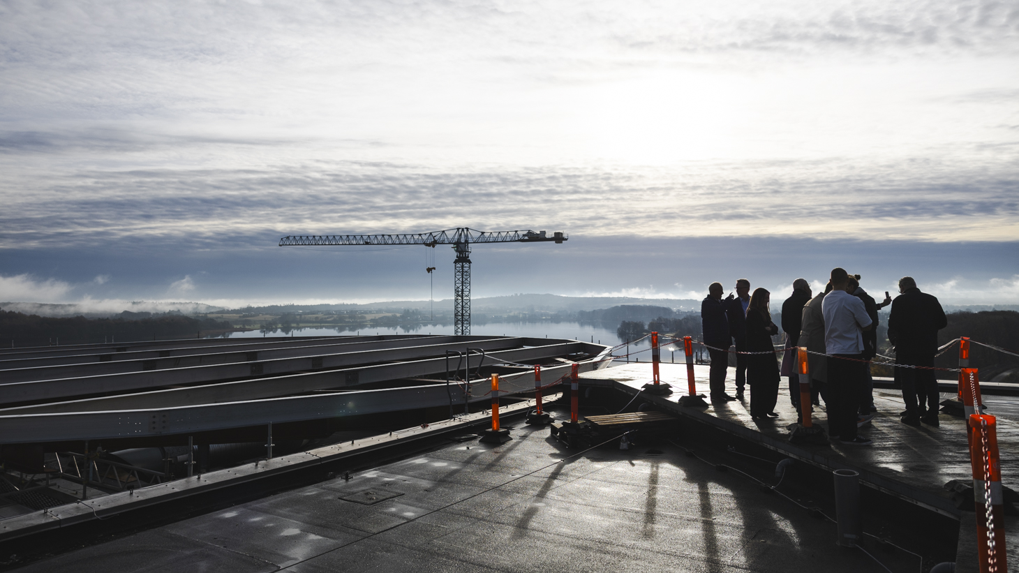 Deltagerne fik mulighed for at komme helt tæt på byggeriet, da Regionshospitalet Viborg fredag holdt rejsegilde for den nye helipad på hospitalets tag. Foto: Agata Lenczewska-Madsen, Regionshospitalet Viborg
