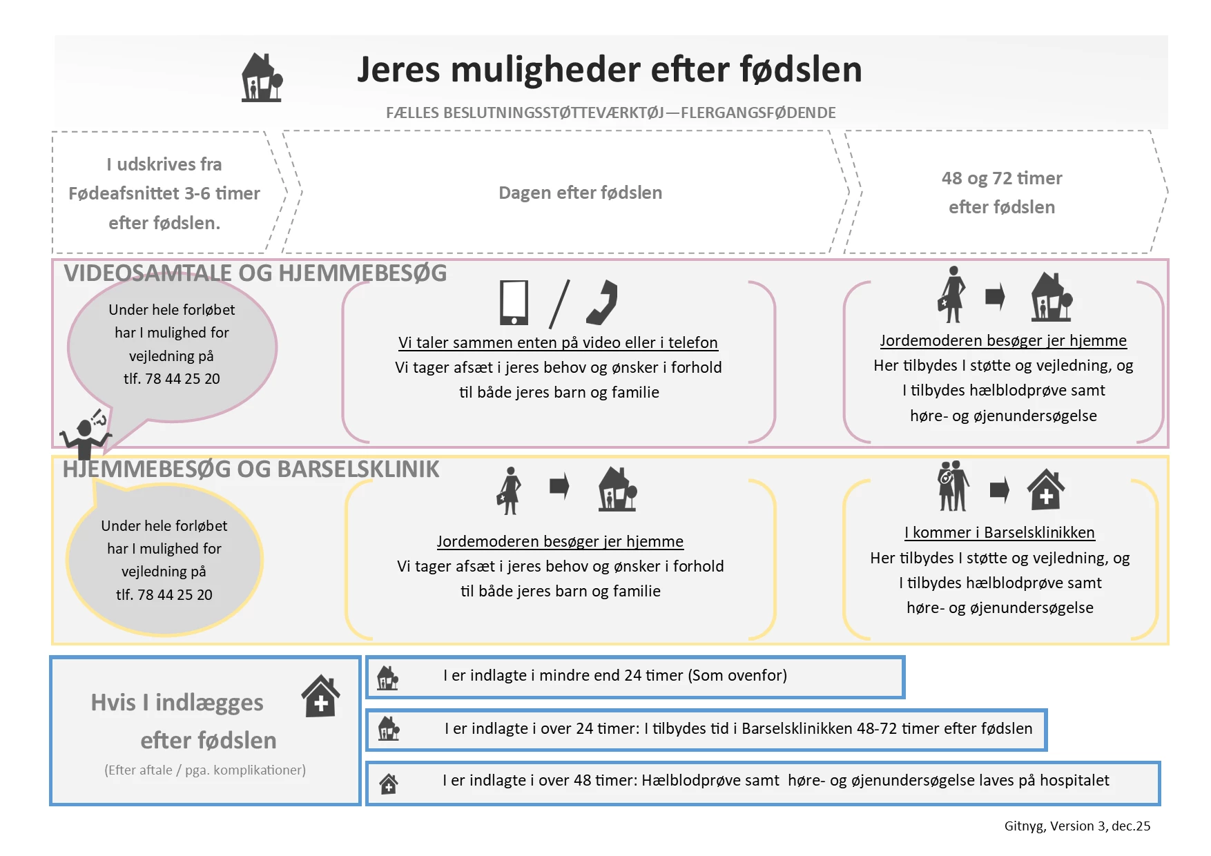 - Mellem 48-72 timer tilbydes i besøg i Barselsklinikken på hospitalet. Her tilbydes i efterfødselspakke, som støtte og vejledning ud fra jeres behov.