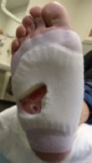 Hvis du har et sår, så skal bandagen i hullet i filten skiftes. Bandagen må ikke gå ud over filten, da sårvæske så vil blive suget ind i filten.