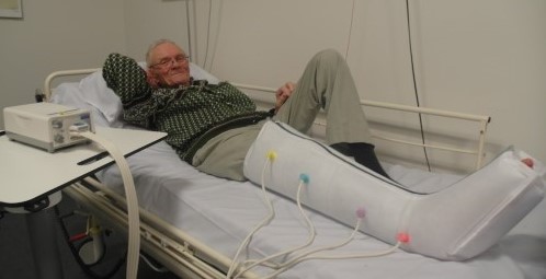 Hvis du behandles på et ben, skal du ligge ned under behandlingen. Det skal du fordi der skal være fri passage, så væsken kan sendes retur mod hjertet.