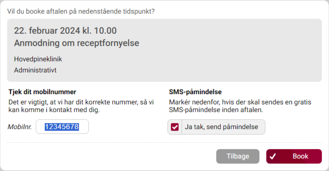 6. Indtast dit mobilnummer i feltet nederst i venstre hjørne og sæt flueben under "SMS-påmindelse", hvis du vil modtage en SMS. Tryk herefter "Book" nederst på siden for at gennemføre bestillingen.