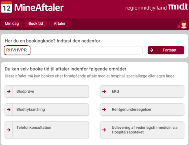 2. MineAftaler åbner på fanen "Book tid" øverst i menuen. Skriv bookingkode "RHVHVPR" i feltet øverst på siden.