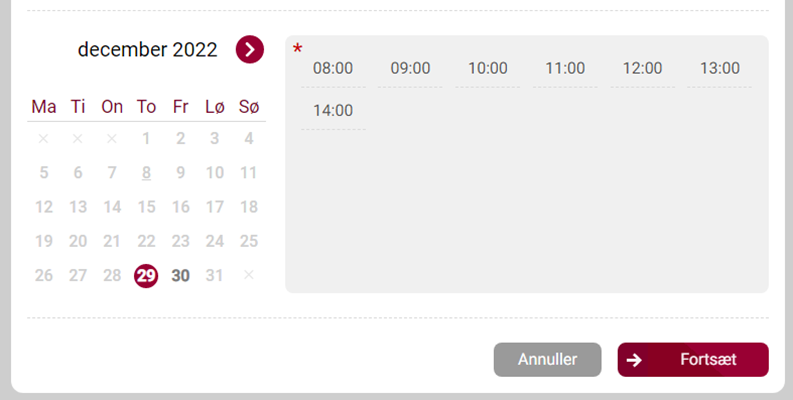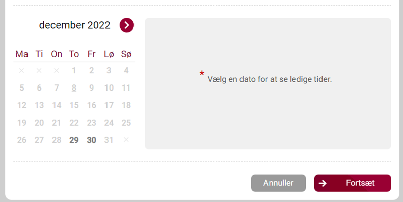 3. Vælg en dato ved at trykke på en ønsket dato (mulige datoer er markeret med fed skrift).