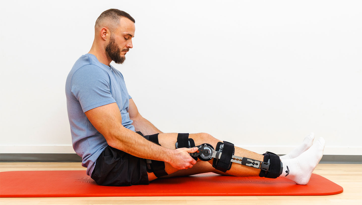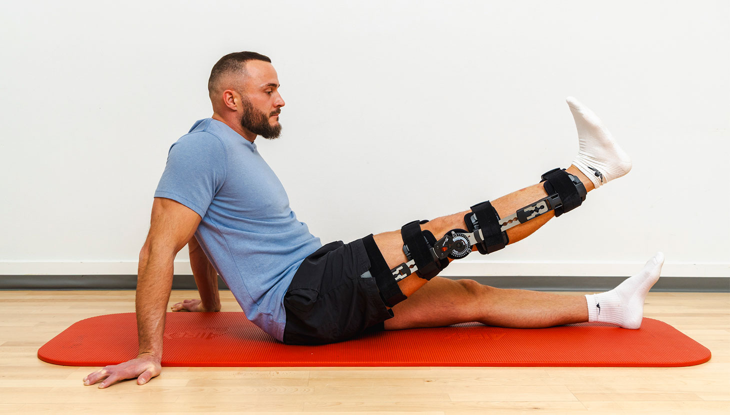 Sid med strakte ben. Bøj og stræk det skadede knæ. Brug eventuelt dine hænder til hjælp.