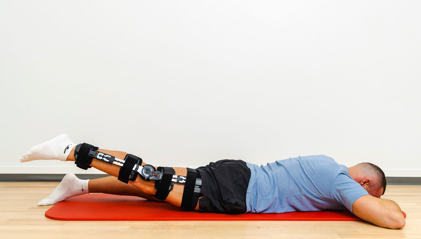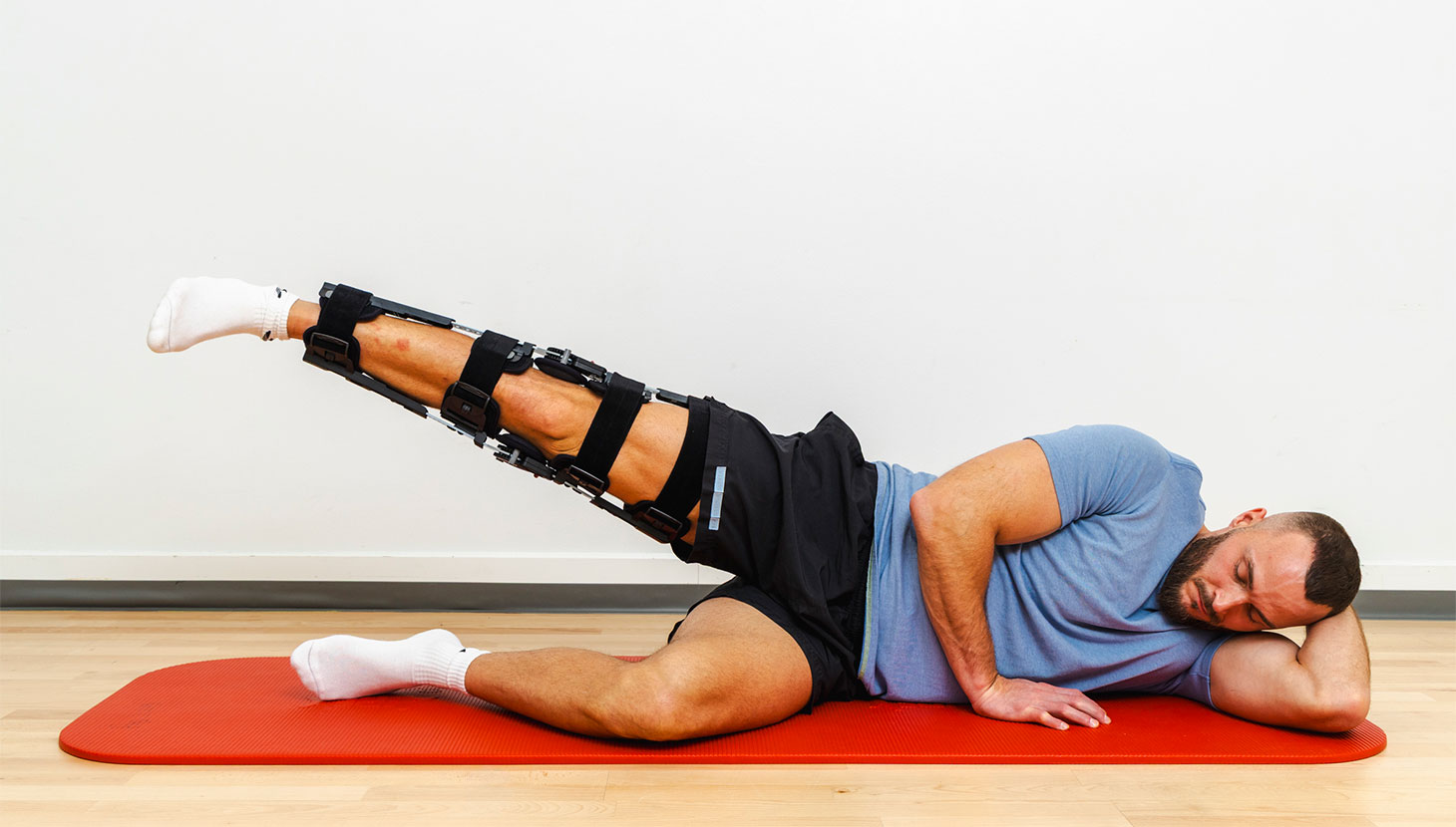 Lig på siden med det skadede ben øverst. Nederste ben er lidt bøjet.