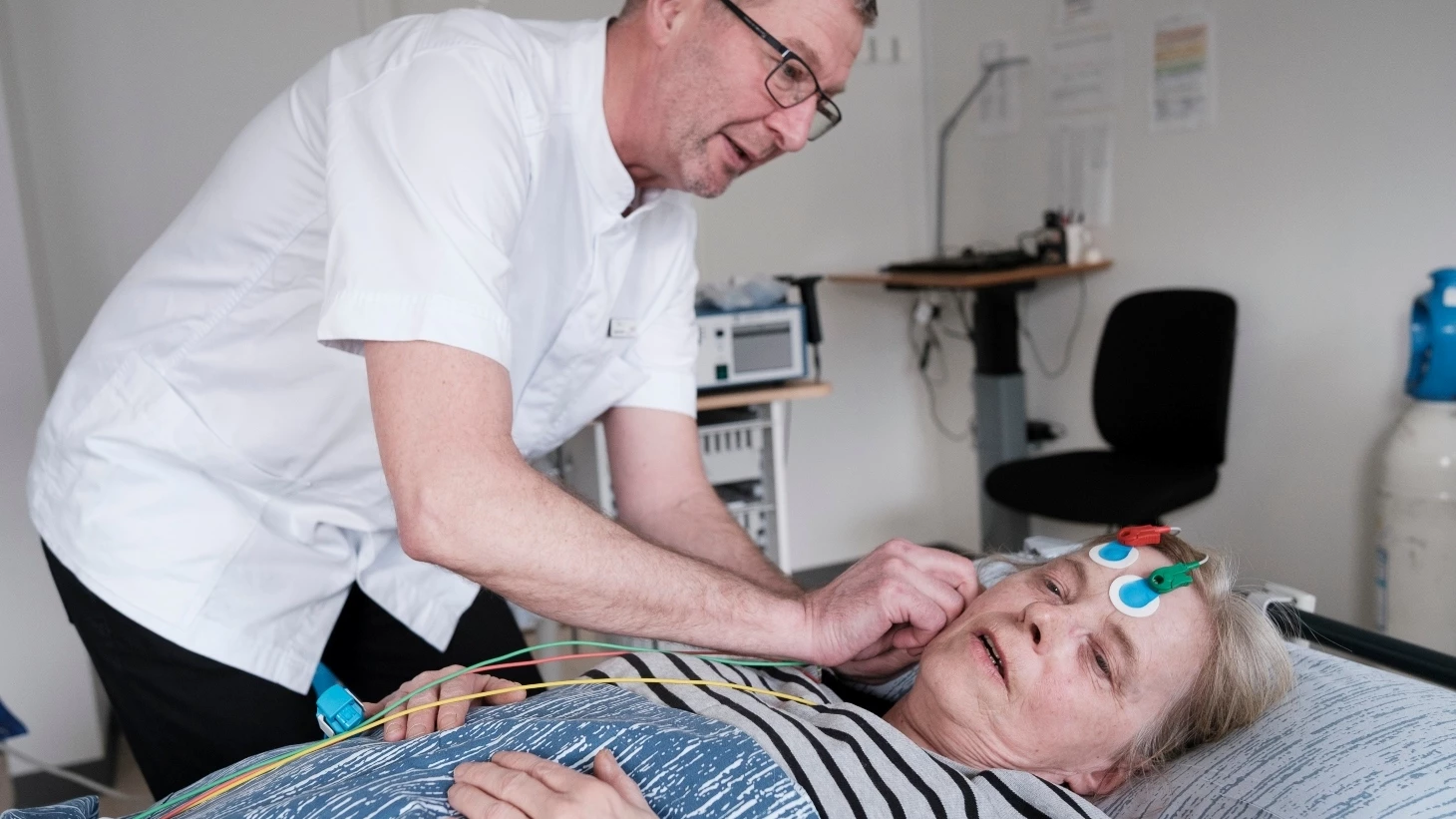 - Det kan også være, at du skal have en blodtryksmanchet på din ene overarm (måler dit blodtryk) og EKG-elektroder på din brystkasse (måler din hjerterytme).