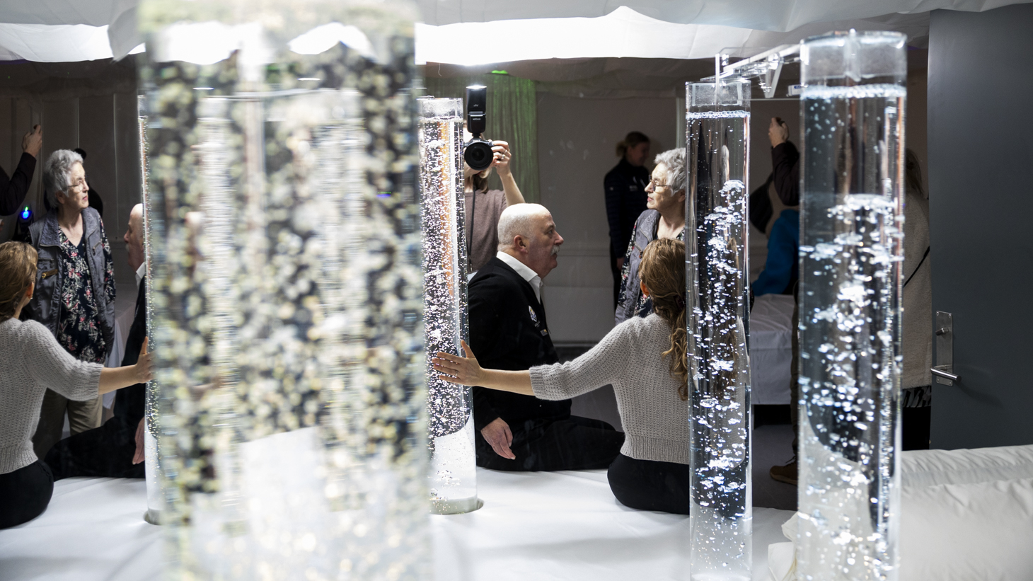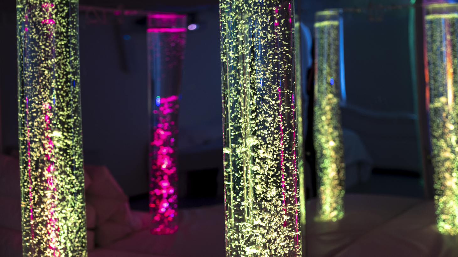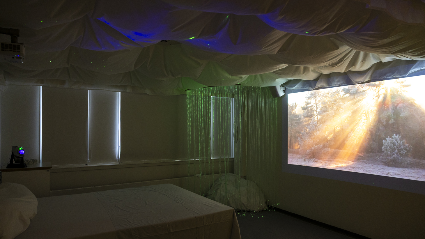 Under en bølgende stofhimmel glider blå og grønne lys over væggene som refleksioner fra en stille skovsø. Et sanseligt frirum forstærket af lyden fra et sagte rislende vandfald, en klukkende boblesøjle og de blide musikalske toner under en vandseng – en symfoni af tryghed for indlagte børn og unge såvel som deres forældre, der har brug for mental ro midt i en svær tid.